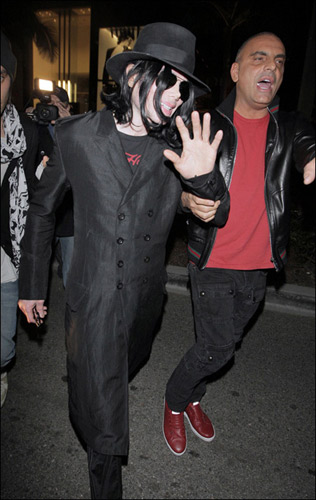 曾經(jīng)的天王,曾經(jīng)的巨星,曾經(jīng)的富豪樂壇最重量級天王邁克爾·杰克遜在宣布拍賣自己的收藏品后首次露面,在設(shè)計(jì)師Christian Audigier的陪同下外出購物。天王不管走到哪里都有無數(shù)的狗仔隊(duì)跟蹤,當(dāng)天的邁克爾·杰克遜身穿黑色禮帽,黑色風(fēng)衣,黑色褲子黑色鞋子,帶黑色蛤蟆鏡,一身黑色更顯得容顏憔悴,皮膚蒼白,我們真的很懷念的那個(gè)曾經(jīng)的天王。