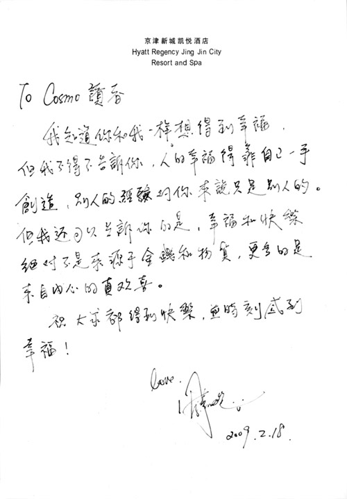 有做筆跡分析的朋友見過(guò)周慧敏的字。她寫道,她的字,是淑女之筆,品相和筆畫運(yùn)勢(shì)上,都均勻而美觀,控制不夸張,足以見得周慧敏內(nèi)心的穩(wěn)定與成熟,懷抱著對(duì)一切美好的期許,或者遇到很多不如意,也還是堅(jiān)持硬撐。