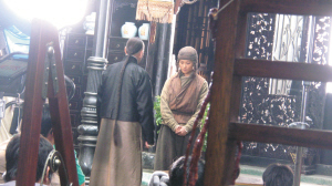 據(jù)了解,這兩張現(xiàn)場照是李宇春第一次進組拍攝時所拍。第一場戲,劇組給她安排的是相對比較輕松的文戲:爸爸“流亡將軍”任達(dá)華死后,她去找組織義士的“老爺”王學(xué)圻問個究竟。雖然是文戲,但也不簡單,李宇春要演出那種爸爸死后自己幾天幾夜不睡覺傷心憔悴的狀態(tài)。據(jù)說李宇春當(dāng)時不知戲份,還被監(jiān)制陳可辛調(diào)侃了一番:“春春你昨晚睡覺了沒?”李宇春不明就里:“我睡了啊,睡得很好,精神很好!标惪尚翐溥暌宦暰托α顺鰜恚骸鞍パ,你不睡才好啊!本瓦@么幾句話,讓李宇春緊張無比。首場戲雖然只有一句臺詞:“我要見你們家老爺。”可李宇春說了整整10遍才通過。