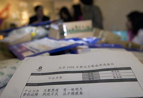 中新網(wǎng)3月12日電 據(jù)北京奧運會官方網(wǎng)站消息,昨天是第四屆北京2008年奧運會歌曲征集評選活動截止的日子,也成為眾多名家和普通百姓提交自己作品的高潮。記者下午在北京2008年奧運會歌曲征集辦公室看到,僅僅今天收到的作品已經(jīng)堆積如山,而這里的工作人員正忙于整理剛剛收到的作品。在這些作品當(dāng)中,記者赫然發(fā)現(xiàn)了“周杰倫”、“林夕”、“方文山”、“小柯”等熟悉的名字。