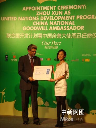 中新社北京四月二十一日電(記者 阮煜琳)聯(lián)合國(guó)開(kāi)發(fā)計(jì)劃署今天北京宣布,任命著名藝人周迅為首位聯(lián)合國(guó)開(kāi)發(fā)計(jì)劃署中國(guó)親善大使,致力于推動(dòng)環(huán)境的可持續(xù)發(fā)展。
