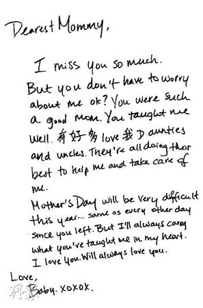 無法要求肥姐再做“母親節(jié)”專訪,所以《明報(bào)》轉(zhuǎn)托欣宜把肥姐的愛延續(xù)下去,記者寫到,當(dāng)欣宜靜靜地在寫給媽咪的信時(shí),我看她的眼淚一直在流,心里真的好痛,就因一個(gè)病,把一對相依為命的母女永遠(yuǎn)分開了,欣宜就要一個(gè)人地走下去,看到她這封信寫著“親愛的媽咪,我好掛念你,但你不用掛心我,你是一位好母親,教導(dǎo)我好好成長,有好多愛我的姨姨與叔叔,他們都盡心盡力照顧我。今年的母親節(jié)對我來說非常之不同,就如你已離開我的每一天一樣,不過我永遠(yuǎn)都記得你教我的一切,你永遠(yuǎn)都在我心里面。我愛你!一直一直的愛你!Baby(肥姐對欣宜的昵稱)”