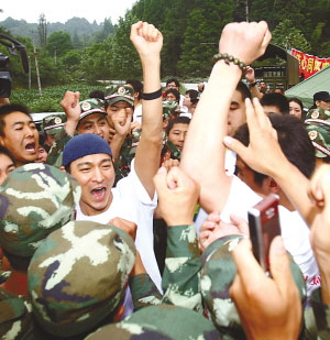 經(jīng)過兩個小時的車程,劉德華一行抵達(dá)了向峨鄉(xiāng)的救援部隊駐地。得知劉德華等人要來,數(shù)千戰(zhàn)士已在那里等候?吹矫餍,平靜的現(xiàn)場沸騰起來。為了維持秩序,士兵們自覺地手拉手圍成一個圈,把明星們圍在里面。