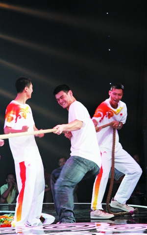 林浩向姚明挑戰(zhàn)拔河。林班長(zhǎng)身后站著四個(gè)孩童,而繩索另一端,是姚明和易建聯(lián)。5個(gè)孩子用盡全力,不敵兩位籃球“巨人”,頑童隊(duì)伍增加到8人,“姚易”手中繩索仍紋絲不動(dòng)。再增至15人,姚易終于敗下陣來,“汗都下來了”姚明擦著額頭。而孩子們則歡呼“團(tuán)結(jié)力量大”。
