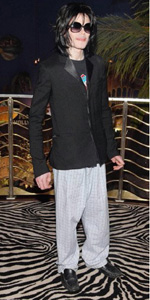 邁克爾·杰克遜近年飽受不利消息困擾,被指周身債之余,唱片銷量也大縮水,不過并沒有影響他慶祝50大壽的心情。上周四他現(xiàn)身賭城Planet Hollywood餐廳,與11歲兒子Prince Michael、10歲女兒Paris及6歲幼子Blanket一起吃晚飯,當日邁克爾心情甚佳,對記者面露笑容,他坐著輪椅,全身用大披風(fēng)緊包,看來十分虛弱,而他拍照時西裝外套下露出的睡褲,格外引人注意。