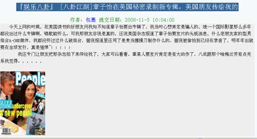 記者近日在國(guó)內(nèi)最大的天涯論壇“娛樂八卦”版上看到,有網(wǎng)友貼出“美國(guó)雜志報(bào)道章子怡要發(fā)片的頭版消息”的帖子,帖子內(nèi)容透露,“章子怡將出首張專輯,還請(qǐng)來了老友公司旗下的5位型男組合A-ONE做伴,曲風(fēng)方面則有麥當(dāng)娜親自制作,據(jù)說現(xiàn)在已經(jīng)在錄音了,明年年出就要在全球發(fā)行!