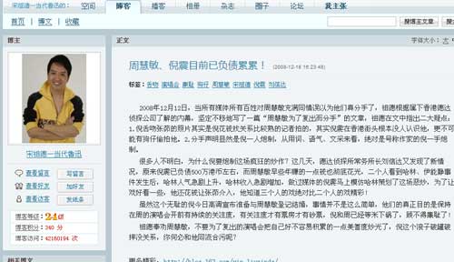 宋祖德在博客里面寫道,他是從自己下屬某公司獲得該內(nèi)幕的,除了知道他們是在炒作外,還獲悉倪震已經(jīng)負(fù)債500萬(wàn)港幣。并炮轟倪震借鑒“伊能靜與庾澄慶婚變事件”策劃出這一起分手復(fù)合戲,其意是在保持周慧敏的關(guān)注度,以便提高周慧敏的演唱會(huì)票房牟利。田雯