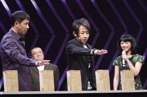 還是春晚那身打扮,劉謙不停給場下高呼他名字的粉絲放電,引發(fā)了一陣陣的尖叫聲。第一次上場,劉謙就用紙巾變成了一條彩帶,并讓彩帶從空中飛出去,把康洪雷導演接到了臺上。不過這只是略施小技,為了考驗康洪雷手下的膽量,劉謙用了五個紙盒,當著眾人的面在其中一個中藏了一個破碎的啤酒瓶,然后讓演員們用力去擊打。還好,經(jīng)過劉謙的“施法”,最后并沒有一人受傷,不過倒把現(xiàn)場觀眾嚇出一身冷汗。最后,劉謙把兩個“團”字變成了一張《我的團長我的團》的海報,就完成自己的這次走穴任務。