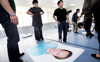 上午10時(shí)許,大廳入口處已經(jīng)擺開一排長桌,工作人員正對著筆記本挑選羅京的相片,仔細(xì)確認(rèn)相片的尺寸后,交代人員去打印以備布置靈堂之用。