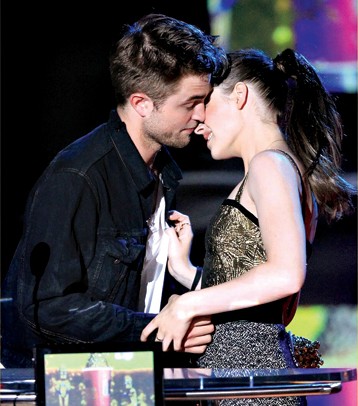 《新月》受追捧主要因?yàn)槟信惶?hào)羅伯特·帕丁森與克里斯蒂·斯圖爾特的化學(xué)作用。而在戲外,兩人也是好萊塢的一對(duì)“明星情侶”。昨日,摘得“最佳接吻”獎(jiǎng)的兩人當(dāng)場為在座觀眾獻(xiàn)上一吻,引來尖叫無數(shù)。