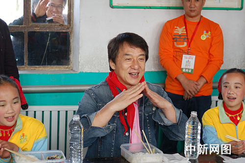臨近午飯時分,成龍與十幾名小學(xué)童每人領(lǐng)到了一盒香菇炒油菜和白米飯的盒飯,在一間簡陋的教室里津津有味地吃了起來。雖然是頭一次與國際巨星成龍在一起吃飯,可這些鄉(xiāng)村娃娃卻一點也不怯場,好奇心驅(qū)使他們左一個問題右一個問題問個不完。而成龍卻面帶笑容地邊吃邊聊,將他的成長經(jīng)歷和成功經(jīng)驗?zāi)托牡匾灰唤獯。眾學(xué)童聽完后,紛紛夸“成龍叔叔好棒啊!”
