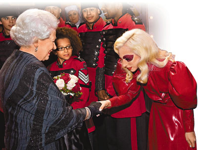 中新網(wǎng)12月9日電 一向衣著打扮出位的Lady GaGa,昨日參與英國(guó)皇家大匯演總彩排時(shí)收起奇裝異服,以鮮紅的衣著和妝容亮相。與前來(lái)捧場(chǎng)的英女王握手時(shí),Lady GaGa受寵若驚,態(tài)度卑躬屈膝。