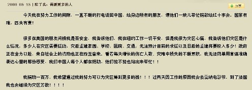 在2008年地震發(fā)生后,北京的同事接到子怡捐100萬(wàn)的指示后,他們分別給紅十字會(huì)捐了兩筆錢(qián)。我們當(dāng)時(shí)都不在國(guó)內(nèi),我也沒(méi)盯這事。但在最近兩個(gè)星期看到媒體報(bào)道說(shuō)捐款總數(shù)沒(méi)有達(dá)到100萬(wàn),我便開(kāi)始調(diào)查此事。當(dāng)我尋找捐款收據(jù)時(shí),才發(fā)現(xiàn)一直沒(méi)有。今天紅十字會(huì)告訴我,捐款的收據(jù)一直在紅十字會(huì)那邊,因?yàn)樗麄儧](méi)有寄出收據(jù)的地址。當(dāng)我了解到收據(jù)細(xì)節(jié)時(shí),才確認(rèn)了善款只有84萬(wàn)元。同時(shí)再了解到當(dāng)時(shí)會(huì)計(jì)和另一個(gè)同事她們?cè)诟髯詤R出金額上出現(xiàn)了紕漏,都以為對(duì)方匯出了差額。