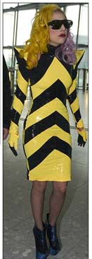 據(jù)臺灣媒體報道,美國女星LadyGaga近日出現(xiàn)在倫敦機場時,竟穿著活像交通標志的黃底黑條紋洋裝一件,很顯然她決定要自己為自己開道,以減少不必要的支出。