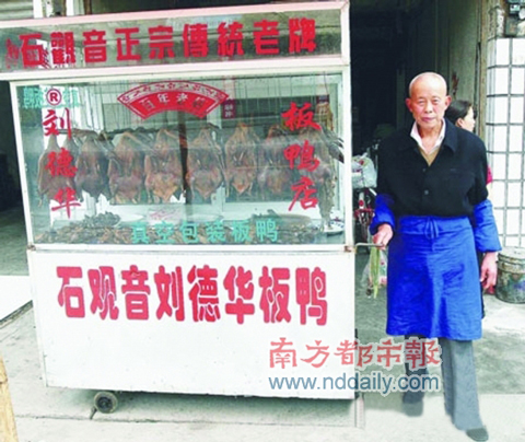 據(jù)悉,觀勝鎮(zhèn)賣板鴨的有幾十家,每一家多用店主名字注冊作為招牌。而劉老伯在1980年已創(chuàng)立以自己姓名命名的板鴨店,2004年申請“劉德華牌板鴨”注冊成商標,2007年申請成功。