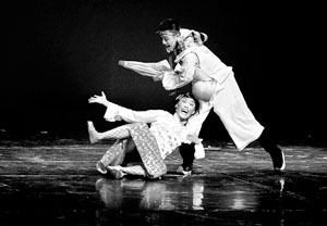 由于開篇背景介紹過(guò)多,前三幕戲略顯沉悶,演員努力抖出的包袱只換得稀稀拉拉的笑聲。