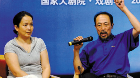 最激動(dòng)的是飾演主角“培爾”的孫海英,打扮隨意的他剛拿起話筒時(shí)語(yǔ)調(diào)十分平靜,還被一旁的老伴呂麗萍調(diào)侃“說(shuō)話像領(lǐng)導(dǎo)”。但談到演《培爾·金特》的感受,他的語(yǔ)調(diào)頓時(shí)激動(dòng)起來(lái),更大嘆“話劇已死”:“現(xiàn)在的戲劇都是在作假,互相說(shuō)假話。人們都太浮躁,明明看不懂我們這部戲,只是看個(gè)熱鬧,到半場(chǎng)就回家了,還愣說(shuō)看得懂———你明白個(gè)屁呀!什么都不明白!藝術(shù)不是因?yàn)槟愣艁?lái)的,是因?yàn)椴欢艁?lái)的,看不懂你就得學(xué)!我們不需要迎合大眾,你愛(ài)來(lái)不來(lái)。”