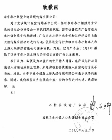 前不久有網(wǎng)友爆料李宇春的照片出現(xiàn)在了重慶市石柱縣龍沙鎮(zhèn)的計(jì)劃生育公益宣傳畫(huà)上,同時(shí)還打出“生男生女一樣好”的口號(hào)。天娛傳媒隨即指出此舉侵犯了李宇春的肖像權(quán)和名譽(yù)權(quán)。如今這張宣傳畫(huà)已經(jīng)被撤除,龍沙鎮(zhèn)人口和計(jì)劃生育辦公室還專程連同廣告公司一起向李宇春發(fā)出“致歉函”。