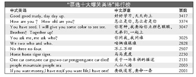 “票選十大爆笑英語”今晨出爐,“Goodgoodstudy,daydayup”(好好學習,天天向上)以3417票高居榜首,成為最受歡迎的中式英語。