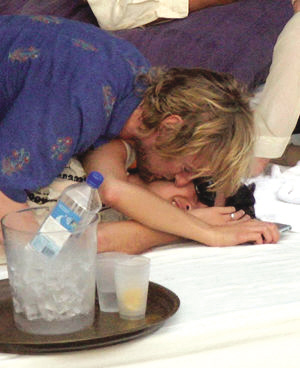 他近日和好友度假時似乎已看不到此前“自殺傾向”的陰影,不時與同行的女伴調笑、玩鬧,并在眾目下一親美女芳澤,毫不遮掩。