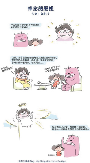 而創(chuàng)作人郭彭子也更新博客,貼出以“悼念肥姐”為題的3幅插圖,借此悼念這位“開心果”,內(nèi)容描繪肥姐過世消息令人非常難過,又將肥姐幻化成天使(上圖),祝她一路好走。