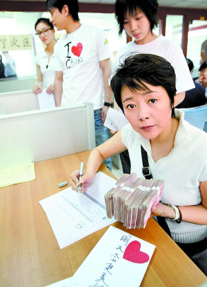 前天,從寧波外景地直接趕回北京的著名演員張瑜,從北京機場直接來到中國扶貧基金會,為汶川災(zāi)區(qū)的孩子們再捐10萬元善款。和張瑜一道同來的還有張瑜導(dǎo)演的電影《八十一格》的兩位青年主演王麗坤和王睿。張瑜說,10萬元對災(zāi)區(qū)人們來說,也許是杯水車薪,但現(xiàn)在災(zāi)區(qū)孩子需要的不僅僅是錢,他們更需要心靈醫(yī)治和撫慰。