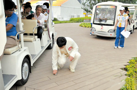 日前,悄悄飛來(lái)北京的成龍大哥,在十多位工作人員的陪同下,走進(jìn)了嶄新的奧林匹克主題公園。身為北京奧運(yùn)義務(wù)宣傳大使的他,這次自然又是為了即將開(kāi)幕的奧運(yùn)盛會(huì),向世界宣傳一座新奧運(yùn)城——北京。半路上,坐在觀光車(chē)上的成龍突然一個(gè)箭步跳下車(chē)來(lái),大哥的這個(gè)動(dòng)作也讓眾人嚇了一跳。而更讓人沒(méi)有想到的是,這位功夫之王現(xiàn)場(chǎng)展現(xiàn)了真功夫,騰空一躍,卻只是為了一個(gè)煙頭。成龍俯身?yè)炱鸸と瞬恍⌒倪z落的煙頭,走到垃圾桶旁丟了進(jìn)去,神情自然,絲毫沒(méi)有作秀成分。