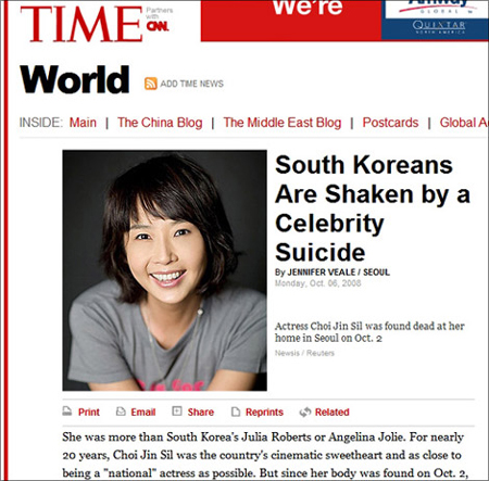 據(jù)《體育朝鮮》報道,美國《時代》雜志網(wǎng)絡版周二(韓國時間7日)通過題為《明星的自殺震驚全體韓國人》(South Koreans Are Shaken by a Celebrity Suicide)的報道,對把崔真實逼向絕路的韓國社會所存在的問題以及崔真實之死在韓國社會引起的震動進行了集中闡述。