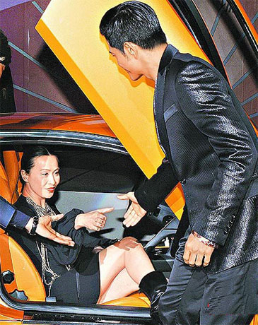 郭富城(右)昨貼心牽劉嘉玲下車,她卻因裙子太短差點走光。