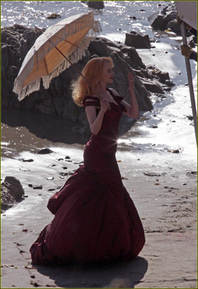 妮可·基德曼2月19日在洛杉磯的某海灘上為某雜志拍攝宣傳寫真,當(dāng)天的妮可·基德曼化身中世紀(jì)的貴婦,穿著暗紅色的絕美長裙,襯得身材玲瓏,肌膚透白,手中的陽傘更是增添了高貴優(yōu)雅,和妮可·基德曼得天獨厚的氣質(zhì)完全符合。