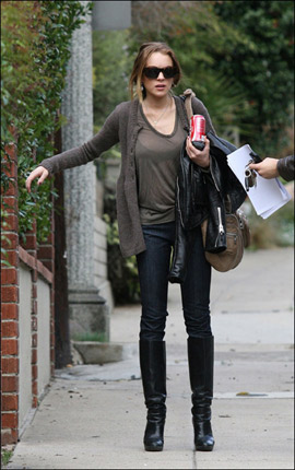情人節(jié)當(dāng)天和同性女友 Samantha Ronson大吵架的林賽·羅韓好像已經(jīng)緩和了,兩個(gè)人被拍到在紐約街頭。當(dāng)天的林賽實(shí)在是范的不一般,咖啡色的開(kāi)身毛衣,搭配里面的半透明的咖啡衣服,內(nèi)衣若隱若現(xiàn)性感非常,下身則是緊身的深藍(lán)色牛仔褲黑色的高跟靴子,襯得雙腿修長(zhǎng)。最重要的是手里的黑色機(jī)車(chē)服,這個(gè)道具已經(jīng)出現(xiàn)在很多明星的手里了,看來(lái)想讓機(jī)車(chē)服不熱都不成了。
