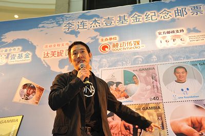 在活動(dòng)現(xiàn)場(chǎng),李連杰與觸動(dòng)傳媒聯(lián)袂揭曉了6枚一套的慈善紀(jì)念郵票。據(jù)了解,這套郵票限量10萬(wàn)套,定價(jià)為111元一套。這個(gè)價(jià)錢是李連杰要求的,因?yàn)?11元符合壹基金“每1人+每1個(gè)月+每1元=1個(gè)大家庭”的理念,而該郵票實(shí)際面值超過(guò)60元。在昨天的活動(dòng)上還發(fā)生了一段小插曲,一名來(lái)自西安的女粉絲在參與觀眾提問(wèn)環(huán)節(jié)時(shí)向李連杰“示愛(ài)”。該粉絲拿到話筒后就顯得很激動(dòng),全身上下不停地抖動(dòng),在哆嗦了半天后她大喊:“我是你西安的影迷,我從小就喜歡看你的電影,我好崇拜你,我夢(mèng)想就是找到像你這樣的老公!贝嗽捯怀鲎層衅抻信睦钸B杰很尷尬,他只好在臺(tái)上傻笑。過(guò)了幾十秒,李連杰才蹦出兩個(gè)字“謝謝”。