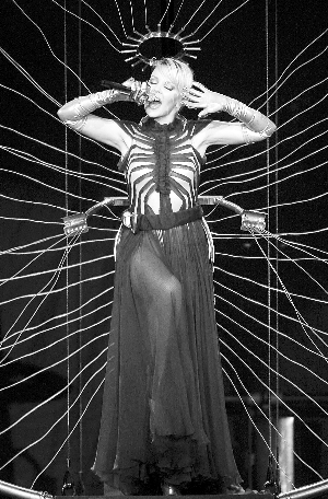 面對全場上萬名觀眾同時注視的這面“鏡子”,凱莉·米洛將伴隨著一種特制的金屑和彩色漂浮物,由遠及近由小變大,最終化身為一個“艷后”。