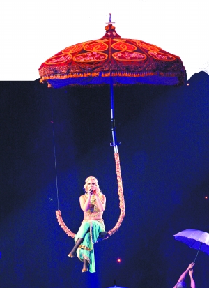3月初,“小甜甜”布蘭妮展開她的復(fù)出巡回演唱會(huì), 多變的造型堪比麥當(dāng)娜,內(nèi)衣外穿,野蠻女警等造型都堪稱火辣。為配合新專輯《馬戲團(tuán)》,布蘭妮打扮成馬戲團(tuán)表演者,在舞臺(tái)上奉獻(xiàn)了很多雜技表演,她還蒙上眼睛與兩名男舞者一起跳舞一起演唱《Touch of My Hand》。她在高空坐在“傘柄”上以印度舞娘造型出場,遠(yuǎn)看甚為驚艷,近看發(fā)現(xiàn)她腹部堆積著贅肉,跳肚皮舞倒是不錯(cuò)。看來布蘭妮還需要減肥。