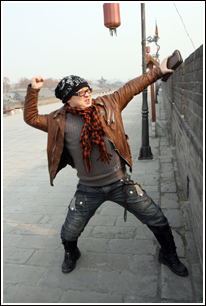 一身嬉皮風(fēng)格的裝扮,加上一副超大的黑框眼鏡,彭波看上去帶有明顯的“謝小盟后遺癥”。雖然只來過西安兩次,但彭波非常喜歡西安。去年在西安拍了一個多月電影,他已把城里好吃好玩的地方摸了個門兒清。他說:“好吃的太多,滿街都是美女。西安人爽快、實(shí)在,在這交了不少朋友,國力隊(duì)的江洪就是我哥哥。我已把這里弄得跟自己家一樣了,到處都特別熟!