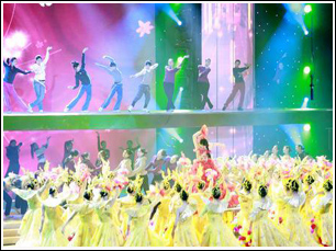 歌舞類節(jié)目時(shí)長(zhǎng)為1小時(shí),記者粗略計(jì)算,僅上半場(chǎng)的歌舞類節(jié)目就占了近50分鐘。開(kāi)場(chǎng)舞《飛向春天》由185位女舞者共同完成,她們不斷變換隊(duì)形,時(shí)而如花潮涌動(dòng),時(shí)而像火山噴發(fā),熱鬧而奢華;舞蹈《飛天》題材獨(dú)特,7位女孩宛若傳說(shuō)中的七仙女,舞步婀娜多姿。歌曲方面,費(fèi)玉清有幸獨(dú)唱《千里之外》,其他歌曲則多以串燒形式登臺(tái),龐龍的《啷咯情歌》、鳳凰傳奇的《月亮之上》、黃圣依的《天天向上》、胡楊林的《香水醉》、張瀾瀾的《一家人》、郭美美的《不怕不怕》分別占據(jù)流行板塊和新人板塊。