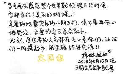 中新網5月21日電 四川發(fā)生巨變,現(xiàn)正以世界小姐身份到全球各地訪問的張梓琳,發(fā)布一份由她親筆寫下的鼓勵災區(qū)小朋友的信件,并急切希望能早日回國參與及幫助災區(qū)的活動。