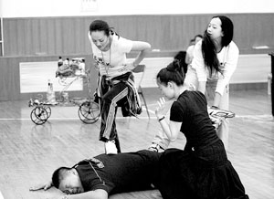 在昨晚的排練中,當(dāng)寧?kù)o劇中的老公到來(lái)后,面對(duì)五大三粗的丈夫,她一聲大吼:“快、快、快來(lái)幫忙,我老公最怕癢了,你們還愣著干嗎,快來(lái)一起制服他!睂⑴髲N潑辣的一面表現(xiàn)得恰到好處。(記者張寧)