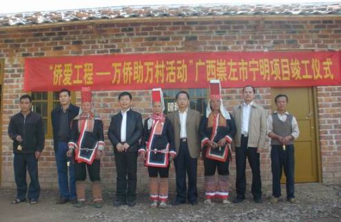 瑯零屯位于十萬大山的捕龍山頂上,海拔近1300米。全屯居住著42戶186名瑤民,全部是1981年底回國的難僑。由于地處高寒山區(qū),環(huán)境惡劣,又缺乏文化科學知識,瑤民們的溫飽問題一直沒有得到解決,居住的全部是危房。2008年,在自治區(qū)僑辦的大力支持和熱心幫助下,引進印尼金光集團董事長黃志源援助30萬元,寧明縣配套48萬元,群眾自籌13.5萬元,異地新建40套磚瓦平房。工程于09年4月開工,在克服了道路不通、建材運輸成本高等重重困難后,于近日竣工。