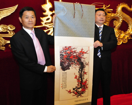 宴會中,國僑辦副主任馬儒沛向華人協(xié)會贈送了字畫。