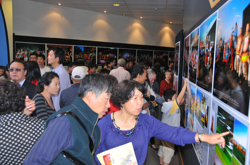 演出前,“文化中國•四海同春”大洋洲藝術(shù)團團長、國務院僑辦副主任趙陽在劇場外大廳為《中華民族全家!穲D片展剪彩。一幅幅圖片展示著中國56個民族多姿多彩的文化生活;匠莾S胞們或駐足欣賞,或興奮地向周邊朋友細說自己在中國的所見所聞。