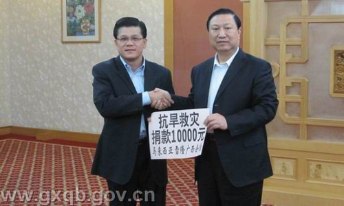 3月26日,馬來西亞雪隆廣西會(huì)館和泰國(guó)廣西總會(huì)永遠(yuǎn)名譽(yù)會(huì)長(zhǎng)饒培中到訪廣西,馮祖華接待了到訪的客人,向他們通報(bào)了廣西的旱情,馬來西亞雪隆廣西會(huì)館和泰國(guó)廣西總會(huì)永遠(yuǎn)名譽(yù)會(huì)長(zhǎng)饒培中當(dāng)即分別向廣西災(zāi)區(qū)捐款一萬(wàn)元和一千元。