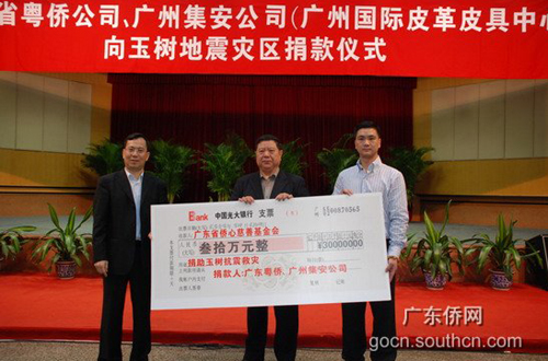 4月24日上午,簡樸熱烈的捐款儀式在廣東省僑辦二樓禮堂舉行。廣東省粵僑企業(yè)總公司黨委書記、總經(jīng)理詹奕群和廣州溫州商會會長、廣州集安投資有限公司董事長朱清國,向廣東省僑辦副主任、省僑心慈善基金會榮譽主席朱爾武遞交了30萬元救災(zāi)捐款支票。廣東省僑辦副巡視員、省僑心慈善基金會監(jiān)事長董華民主持捐贈儀式并講話,他充分肯定了粵僑企業(yè)總公司、集安投資有限公司履行社會責任,積極參與賑災(zāi)濟困,為國分憂、為民紓難的善舉。據(jù)悉,這筆善款將經(jīng)由廣東省慈善總會盡快匯往玉樹災(zāi)區(qū)。