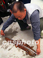 圖:為娃娃魚尋找放生地 2001年10月05日 10:35 ![]() 由于黑河引水工程,陜西省周至縣黑河大橋下游淺灘近日頻頻發(fā)現(xiàn)娃娃魚,大橋收費站的工作人員出于對珍稀動物的保護,準(zhǔn)備將這條重三公斤、身長七十五厘米的娃娃魚尋找放生地,以保護這一地區(qū)的生態(tài)平衡。中新社圖 尚鴻珠 攝 |
