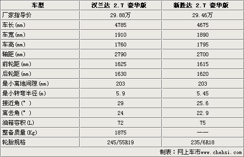 國產(chǎn)漢蘭達(dá)和現(xiàn)代新勝達(dá)均屬于一個級別的城市SUV車型,兩款車型均是2.7排量的高配車型,售價相差了4200元。在車身尺寸方面,國產(chǎn)漢蘭達(dá)在車長、車寬、均超過了現(xiàn)代新勝達(dá),這一點(diǎn)保證了其內(nèi)部橫向空間及頭部空間的寬敞。在軸距方面,豐田漢蘭達(dá)比新勝達(dá)長出了90mm,這一點(diǎn)意味著漢蘭達(dá)的腿部空間將會優(yōu)越于新勝達(dá)。兩款車型的離地空間都達(dá)到了203mm,確保了它們在復(fù)雜路面上的道路通過性。越野性能方面,國產(chǎn)漢蘭達(dá)要優(yōu)越于新勝達(dá),這點(diǎn)從接近角和離去角的數(shù)據(jù)就可以看出來。豐田漢蘭達(dá)的前后輪距和輪胎橫截面數(shù)據(jù)都要大于新勝達(dá),這表明在操控性能上漢蘭達(dá)將會略勝一籌。漢蘭達(dá)和新勝達(dá)的油箱均達(dá)到了75升上下,可以為其提供良好的續(xù)航能力。