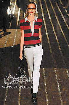 在Gucci今季以揚(yáng)帆出海為主題的日間裝扮中,可以見(jiàn)到一條簡(jiǎn)潔清爽的白色鉛筆褲貫穿始終,上身的海軍藍(lán)、白色及紅色條紋T恤,則用性感的低V設(shè)計(jì)來(lái)吸引人,腰帶細(xì)得若有若無(wú),腳上是耀眼的金色高跟鱷魚(yú)皮鞋,既給人較中性化的感覺(jué),又不失女性的韻味。要帥又要不失性感,實(shí)際上,這就是新帥男孩的最佳尺度。