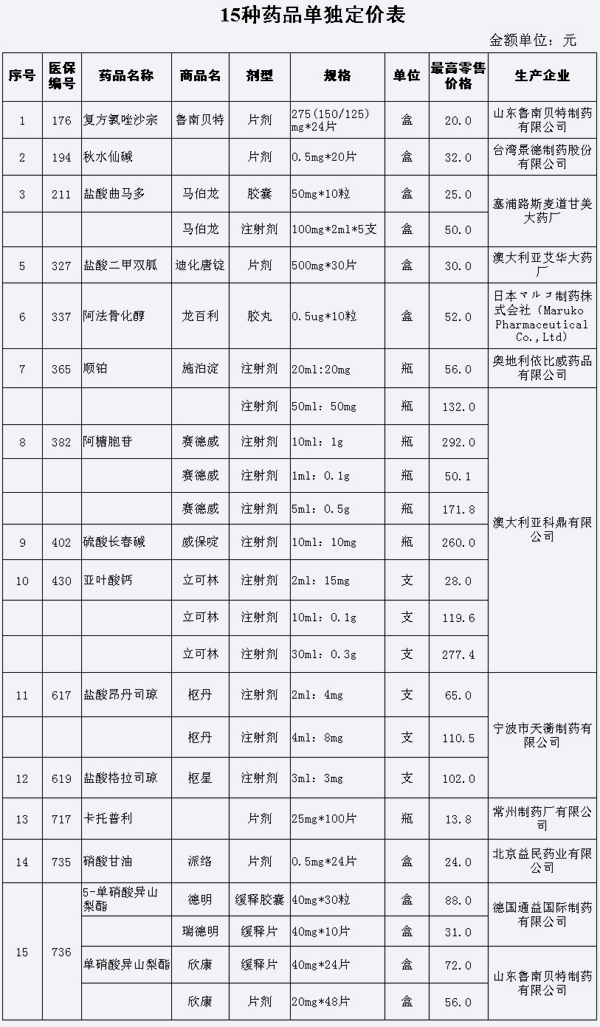 中新網(wǎng)11月23日電 國(guó)家發(fā)改委發(fā)布消息稱,根據(jù)國(guó)家發(fā)改委組織專家論證的意見(jiàn),為滿足臨床需要,現(xiàn)將部分仿制藥品單獨(dú)定價(jià)方案予以公布。表列藥品價(jià)格自2005年11月14日起執(zhí)行。
