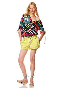 Kookai模特將寬松Tee的一側(cè)肩頭隨意扯下,橫的條紋被拉出傾斜效果,加上不修邊幅的拉扯感,仿佛由淑女變成了熱情奔放的嘻哈女孩,帥氣的寬褲腿以及可愛的蓬蓬裙都能襯得起這樣的不羈。ARMANIJEANS更加勇敢,將寬松的低胸花襯衫一側(cè)拉低,與鮮艷的小短褲一同制造最動(dòng)人的單膊look。當(dāng)然,這樣做的首要一條是做足保險(xiǎn),千萬(wàn)別以走光作代價(jià)。