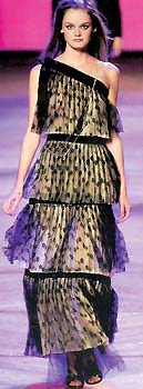 日前,身材高挑的梁詠琪演繹了一件MarcJacobs黑色單膊蕾絲長(zhǎng)裙,分列的四層蕾絲有如寶塔林立,將身體均衡地切割成四塊,顯得高貴時(shí)尚,隆重至極。其實(shí)單膊設(shè)計(jì)在長(zhǎng)長(zhǎng)的禮服裙上早已經(jīng)屢見不鮮,這些升級(jí)版的單膊造型往往更注重豪華實(shí)質(zhì),不怕繁復(fù),只怕未能出其不意。