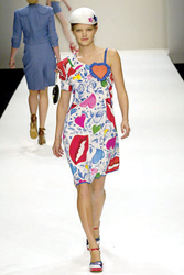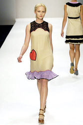 Rebecca Taylor的乖乖女設計,讓我們看到了充滿學生味的情竇初開,同樣將愛心做成口袋的還有Eley Kishimoto,將絲綢和蕾絲拼合而成的短裙,那個醒目的紅色愛心不時跳躍在模特輕松的步伐上。愛心的另一種表現(xiàn)則被設計師們巧妙地運用在了腰帶上,Luella和Moschino的愛心都不約而同地被安置在了腰帶上,原來對現(xiàn)代女生而言不用金箭也是可以將愛心牢牢綁住的。